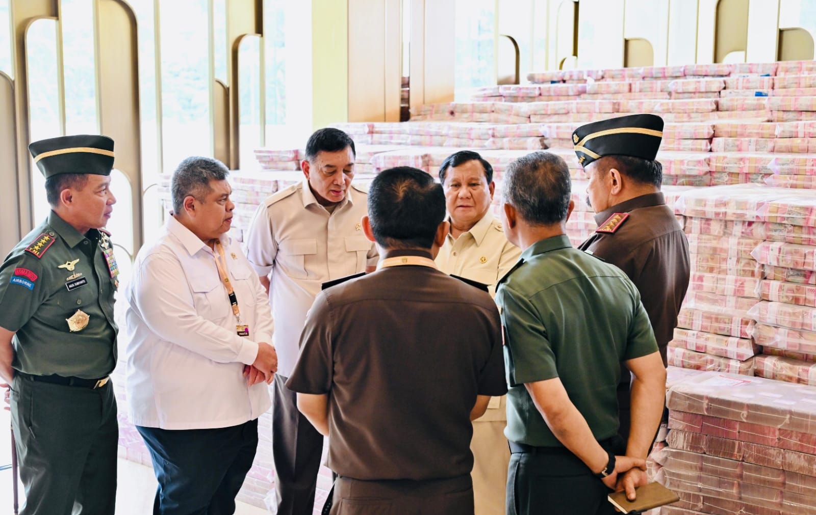 IPNews. Jakarta. Panglima TNI Jenderal TNI Agus Subiyanto mendampingi Presiden Republik Indonesia Prabowo Subianto dalam acara penyerahan uang pengganti kerugian negara sebesar Rp 13.255.244.538.149,00 dari Kejaksaan Agung (Kejagung) kepada Kementerian Keuangan, yang berlangsung di Gedung Utama Kompleks Kejaksaan Agung RI, Jakarta, Senin (20/10/2025). Penyerahan ini merupakan hasil pengungkapan kasus tindak pidana korupsi dalam pemberian fasilitas ekspor Crude Palm Oil (CPO) dan turunannya.