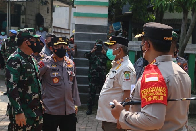 Wali Kota Bekasi, Rahmat Effendi bersama Kapolres Metro Bekasi Kota, Kombes Pol A. Suprijadi, dan Dandim 0507 Bekasi, Kolonel Arm. Iwan Apriyanto mendampingi Panglima TNI dan Kapolri untuk memantau kondusifitas posko PPKM skala Mikro di wilayah tersebut.