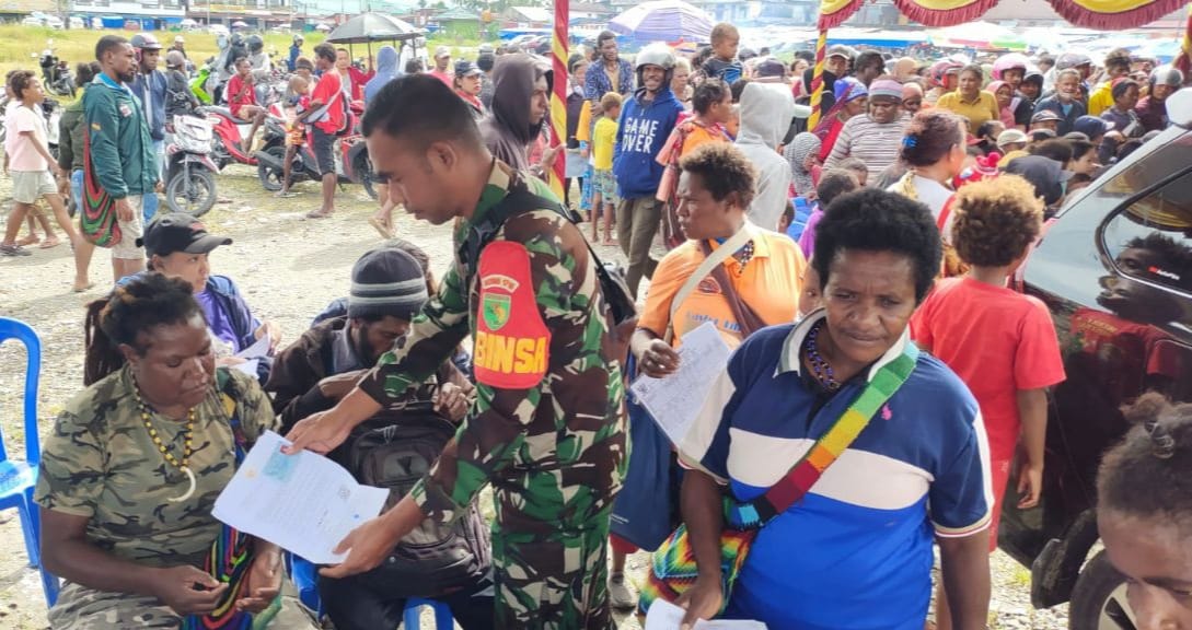 IPNews. Timika. Dalam rangka membantu dan mengamankan proses penyaluran Bantuan Sosial (Bansos) program keluarga harapan, Babinsa Koramil 1710-02/Timika Serda Zulhijah melaksanakan pendampingan Bansos bertempat di Lapangan Pasar Lama Timika, Distrik Mimika Baru, Kabupaten Mimika, Selasa (23/05/2023).
