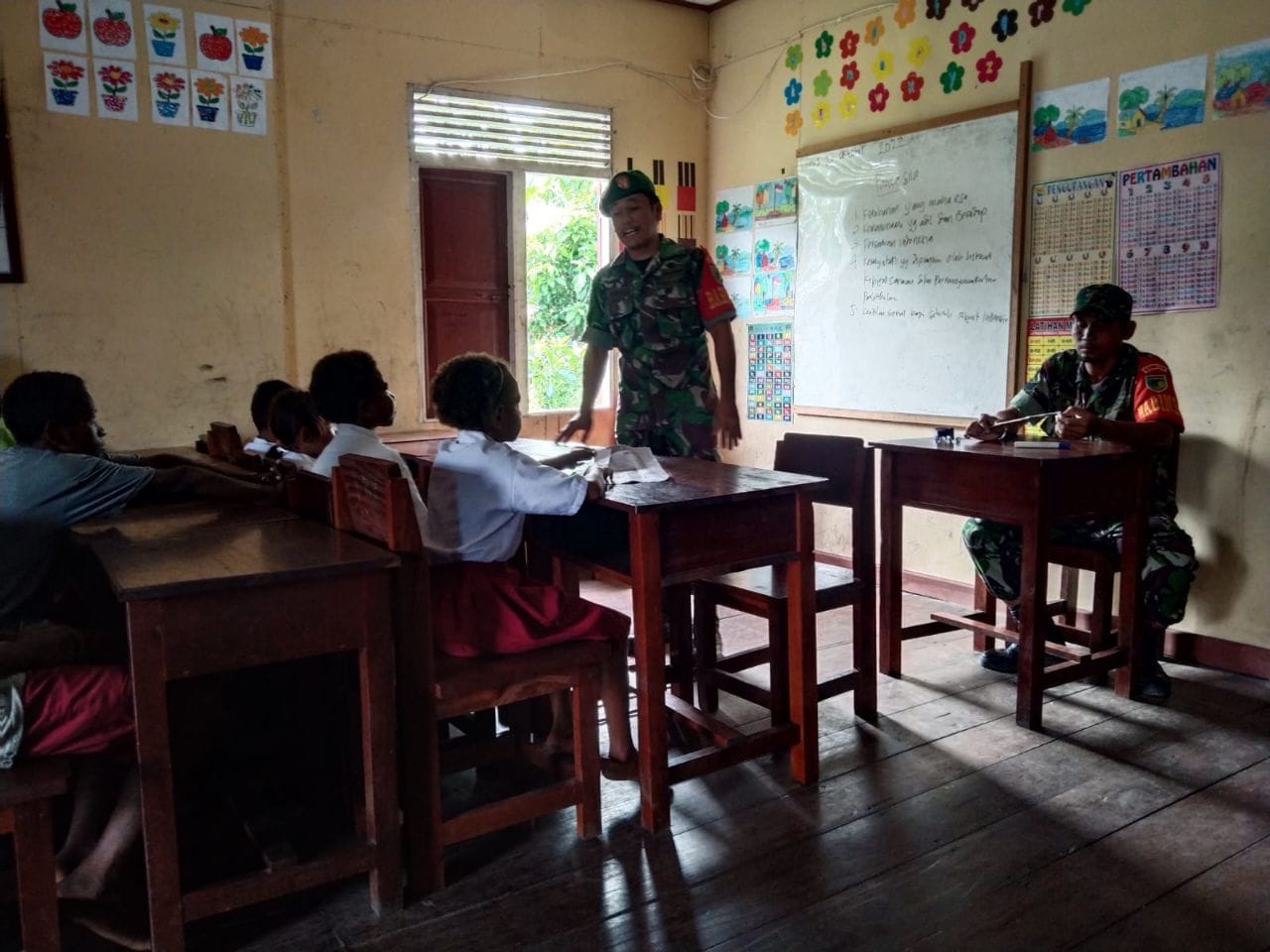 Untuk itu, sebagai bentuk nyata kepedulian TNI dalam melaksanakan pengabdian terhadap NKRI serta sebagai wahana dalam menambah pengetahuan pribadi, Babinsa Koramil 1710-01/Kokonao Serka Sinaga membantu proses belajar mengajar kepada siswa-siswi SD Inpres Kokonao Distrik Mimika Barat. Kabupaten Mimika, Sabtu (22/10/2022).