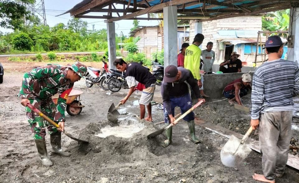 IPNews. Timika. Meningkatkan hubungan yang erat bersama warga di lingkunganya, anggota Babinsa Koramil 1710-07/ Mapurujaya Sertu Selamet Riyadi bersama warga masyarakat melaksanakan kegiatan kerja bakti pembangunan Masjid Nurul Hikmah di Kp. Muare Distrik Mimika Timur, Kabupaten Mimika, Senin (16/01/2023).