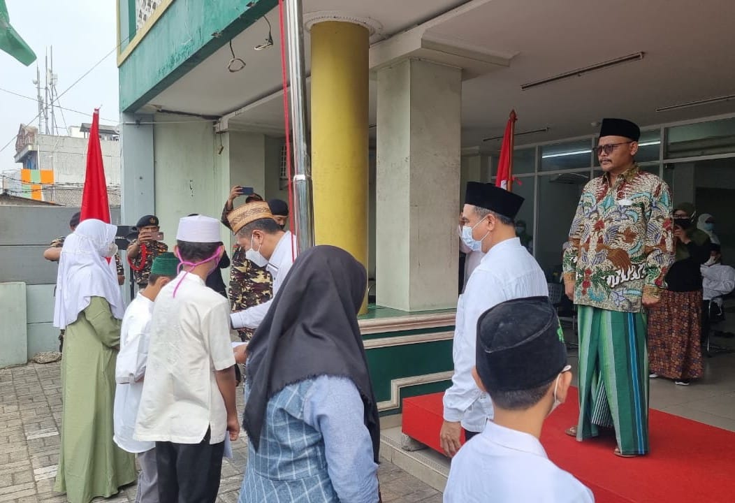 IPNews. Jakarta. Pengurus Wilayah Nahdlatul Ulama DKI Jakarta (PWNU DKI Jakarta), menggelar Apel bersama, Peringatan Hari Santri Nasional 2021. Sekaligus memberikan santunan Kepada para santri yatim piatu terdampak Covid-19. Bertempat di halaman Kantor PWNU DKI Jalan Utan Kayu Raya, No 112 Matraman Jakarta Timur.Sabtu, (23/10/21).