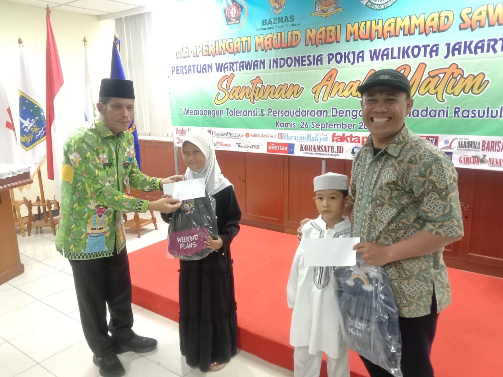 Santunan yang diberikan kepada anak yatim selain bentuk uang tunai juga diberikan perlengkapan berupa tas, buku dan pensil warna Bantuan juga diberikan di kepada tiga anggota wartawan yang saat ini lagi sakit.