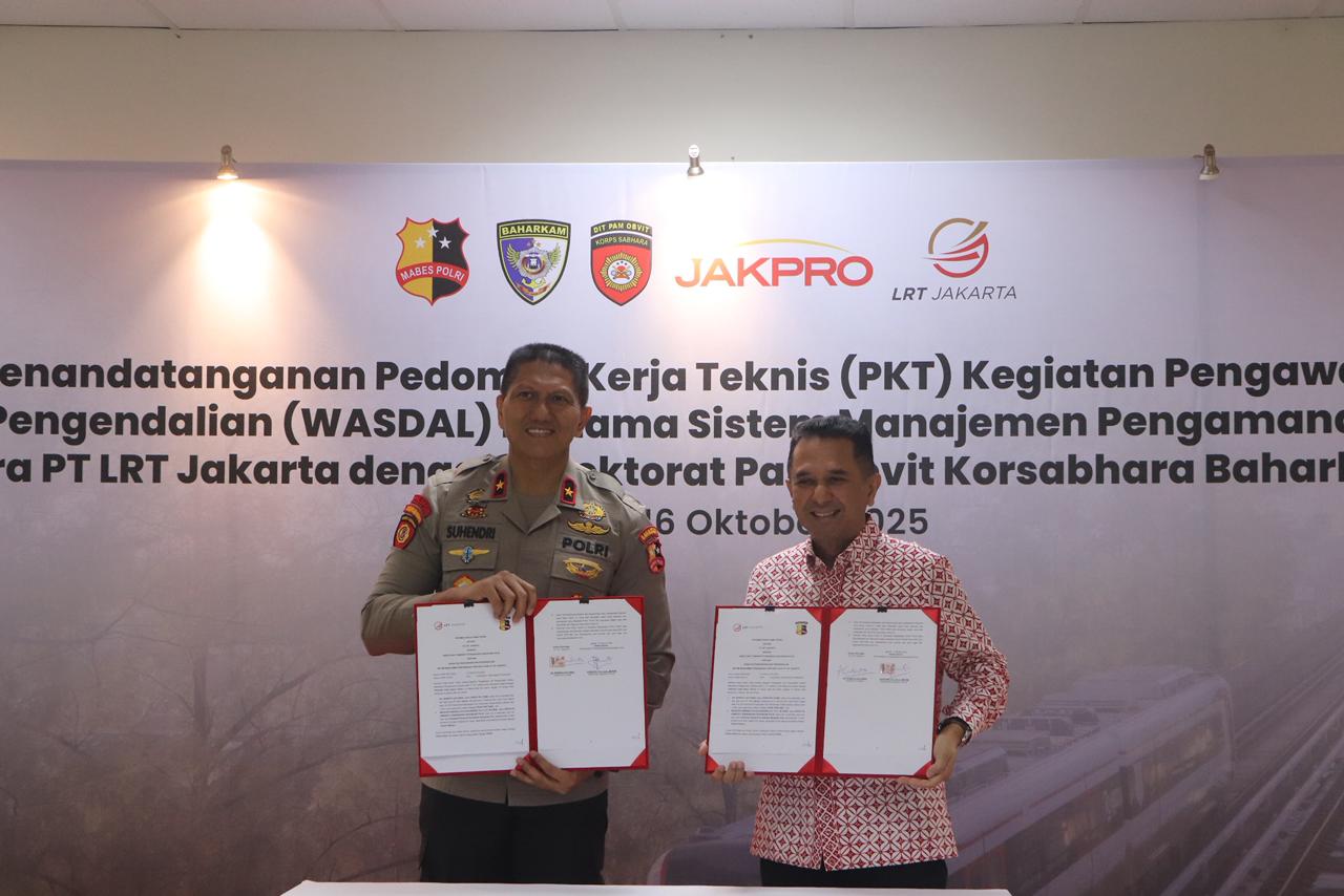 IPNews. Jakarta. PT. LRT Jakarta, sebagai pengelola layanan transportasi publik Light Rail Transit (LRT) di Jakarta, secara resmi memperkuat komitmennya dalam menjamin keamanan dan kenyamanan penumpang serta aset perusahaan. Hal ini ditandai dengan dilaksanakannya Penandatanganan Pedoman Kerja Teknis (PKT) Pengawasan dan Pengendalian (Wasdal) Sistem Manajemen Pengamanan (SMP) antara PT LRT Jakarta dengan Direktorat Pengamanan Objek Vital (Ditpamobvit) Korsabhara Baharkam Polri.