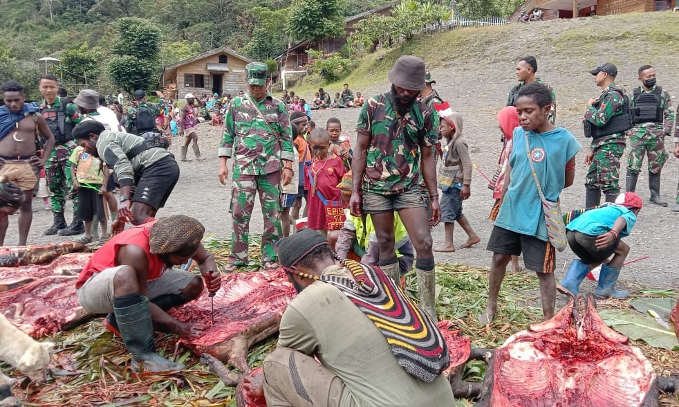 IPNews. Merauke. Dalam rangka mendukung pembangunan jalan poros Kampung Banti- Arwanop, Distrik Tembagapura, Kabupaten Mimika, ratusan warga dari empat kampung yaitu Kampung Omponi, Kampung Anggogain, Kampung Jagamin dan Kampung Baluni, menghadiri acara bakar batu dan doa syukur yang dilaksanakan di halaman Kampung Arwanop, Kabupaten Mimika, Papua, Sabtu (30/10/2021).