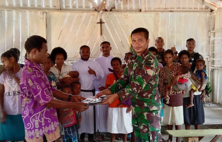 IPNews. Keerom. Perayaan hari Raya Paskah di wilayah perbatasan, anggota Pos Tatakra Satgas Pamtas RI-PNG Yonif 126/KC melaksanakan ibadah sekaligus bhakti sosial membagikan pakaian baru kepada jemaat Gereja ST Yohanes di Kampung Tatakra, Distrik Web, Kabupaten Keerom.