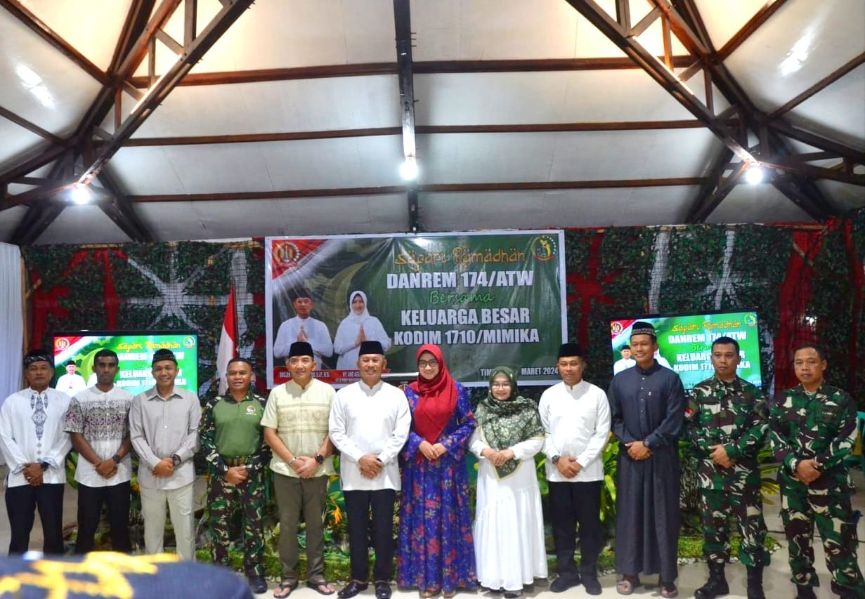 IPNews. Timika. Komandan Korem 174/ATW Brigjen TNI Agus Widodo, S.I.P., M.Si. didampingi Ny. Ane Agus Widodo (Ketua Persit KCK Koorcab Rem 174) melaksanakan Safari Ramadhan bersama keluarga besar Kodim 1710/Mimika. kegiatan ini bertempat di Makodim 1710/Mimika, jalan Agimuga Mile 32, Distrik Kuala Kencana, Kabupaten Mimika, Sabtu (30/3/2024).