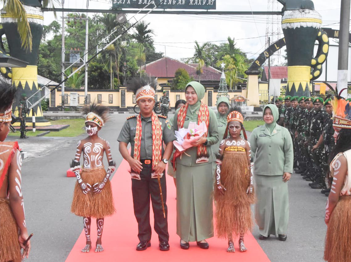 IPNews. Timika. Kedatangan Komandan Kodim 1710/Mimika yang baru, Letkol Inf Redi Dwi Yuda Kurniawan, S.I.P., didampingi Ketua Persit Kartika Chandra Kirana Cabang XXXV Kodim 1710/Mimika, Ny. Redi Dwi Yuda Kurniawan, disambut dengan prosesi tarian adat sebagai bentuk penghormatan dan penerimaan warga baru. Kegiatan tersebut berlangsung di Makodim 1710/Mimika, Selasa (23/12/2025).
