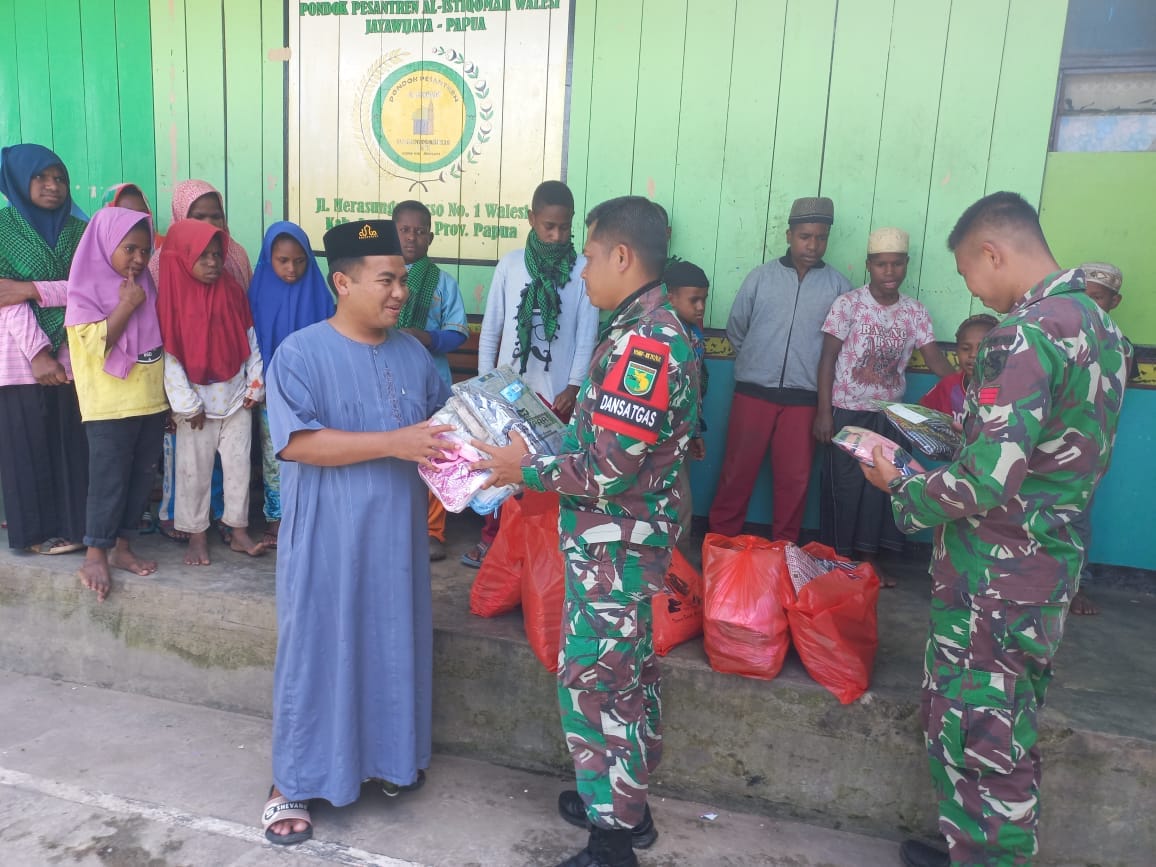 IPNews. Jayawijaya. Kepedulian Satgas Kodim Yalimo Yonif RK 751/VJS dalam meningkatkan pelaksanaan ibadah bagi para santriwan dan santriwati yang ada di Pesantren Al-Istiqomah, diwujudkan dengan membagikan pakaian berupa baju koko dan mukena kepada seluruh para santri.