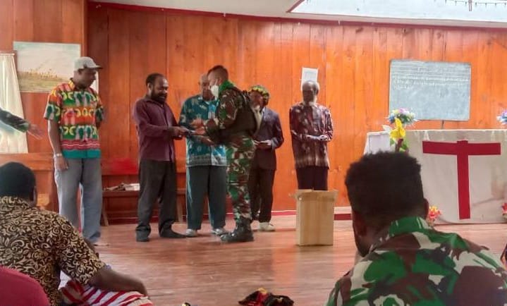 Dalam kegiatan Komunikasi Sosial dengan Tokoh Agama di wilayah Tolikara itu, Satgas Pamrahwan Yonif RK 751/VJS membagikan Alkitab kepada Jemaat Gereja Imanuel, Distrik Kanggime, Kabupaten Tolikara, yang diterima langsung oleh Pendeta Ambe Wenda dihadapan para Jemaat.