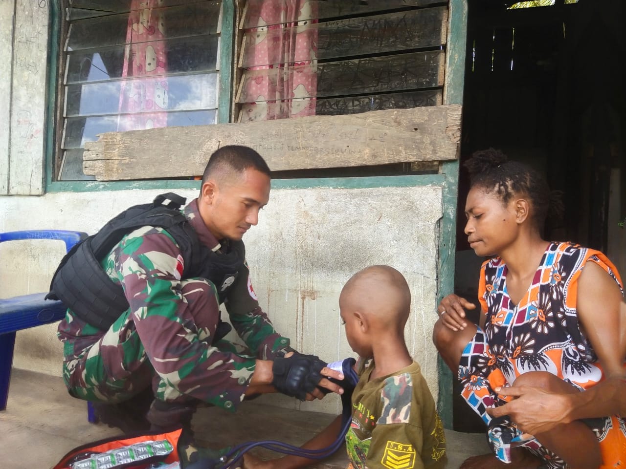 Personel kesehatan Satgas Pamtas Yonif 126/KC Pos KM 140 kembali mendatangi rumah-rumah warga untuk melakukan pemeriksaan kesehatan dan pengobatan secara rutin di Kampung Monggoefi, Distrik Yaffi, Kabupaten Keerom, Papua.