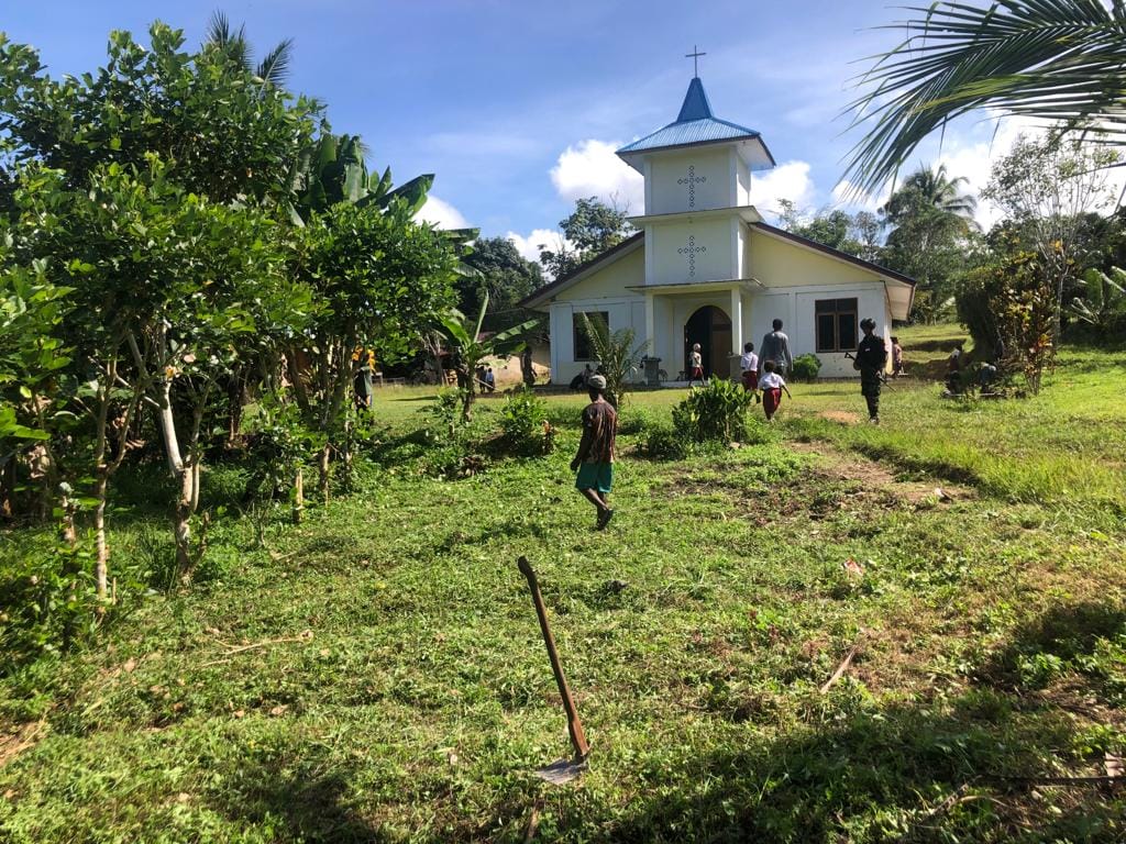 IPNews. Keerom. Menciptakan lingkungan yang bersih dan sehat, Pos Ubrub Satgas Pamtas Yonif 126/Kala Cakti bersama warga Kampung Umuaf melaksanakan kerja bakti pembersihan Gereja Katolik ST Paroki di Kampung Umuaf, Kabupaten Keerom, Papua.