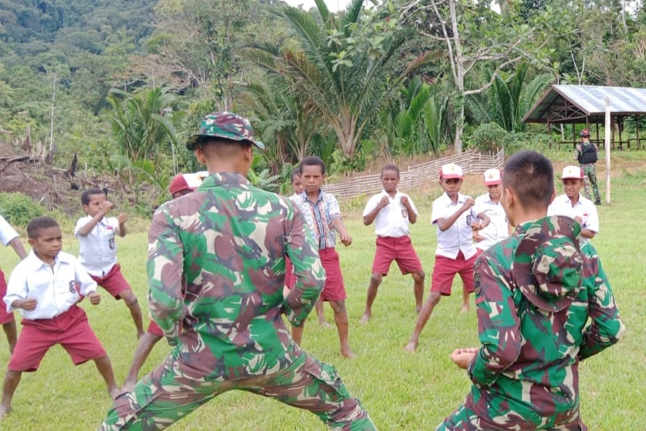 IPNews. Keerom. Personel Satgas Pamtas RI-PNG Yonif 126/KC melatih beladiri Karate kepada anak-anak sekolah di Perbatasan Papua. Hal tersebut disampaikan Dansatgas Pamtas Yonif 126/Kala Cakti, Letkol Inf Dwi Widodo, S.H.,M.Han dalam rilis tertulisnya di Kabupaten Keerom, Papua, Kamis (03/02/2022).