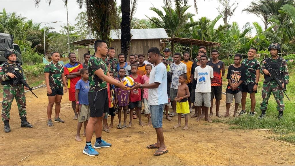 “Olahraga voli ini sangat menjadi salah satu olahraga yang disukai pemuda dan masyarakat perbatasan di Papua, namun minimnya dan mahalnya fasilitas sarana dan prasana olahraga tersebut, sontak membuat personel kami untuk membantu dalam menyalurkankan hobinya dengan memberikan satu set net dan bola voli,” ujarnya.