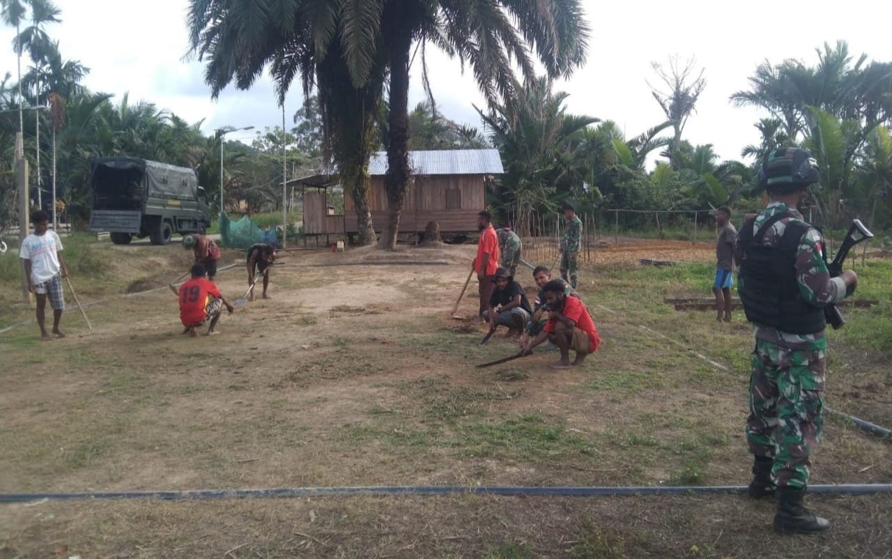 IPNews. Keerom. Pos Yuruf Satgas Pamtas Yonif 126/KC mengajak masyarakat melakukan karya bakti pembersihan lapangan Voli di Kampung Yuruf, Distrik Yaffi, Kabupaten Keerom, Papua.