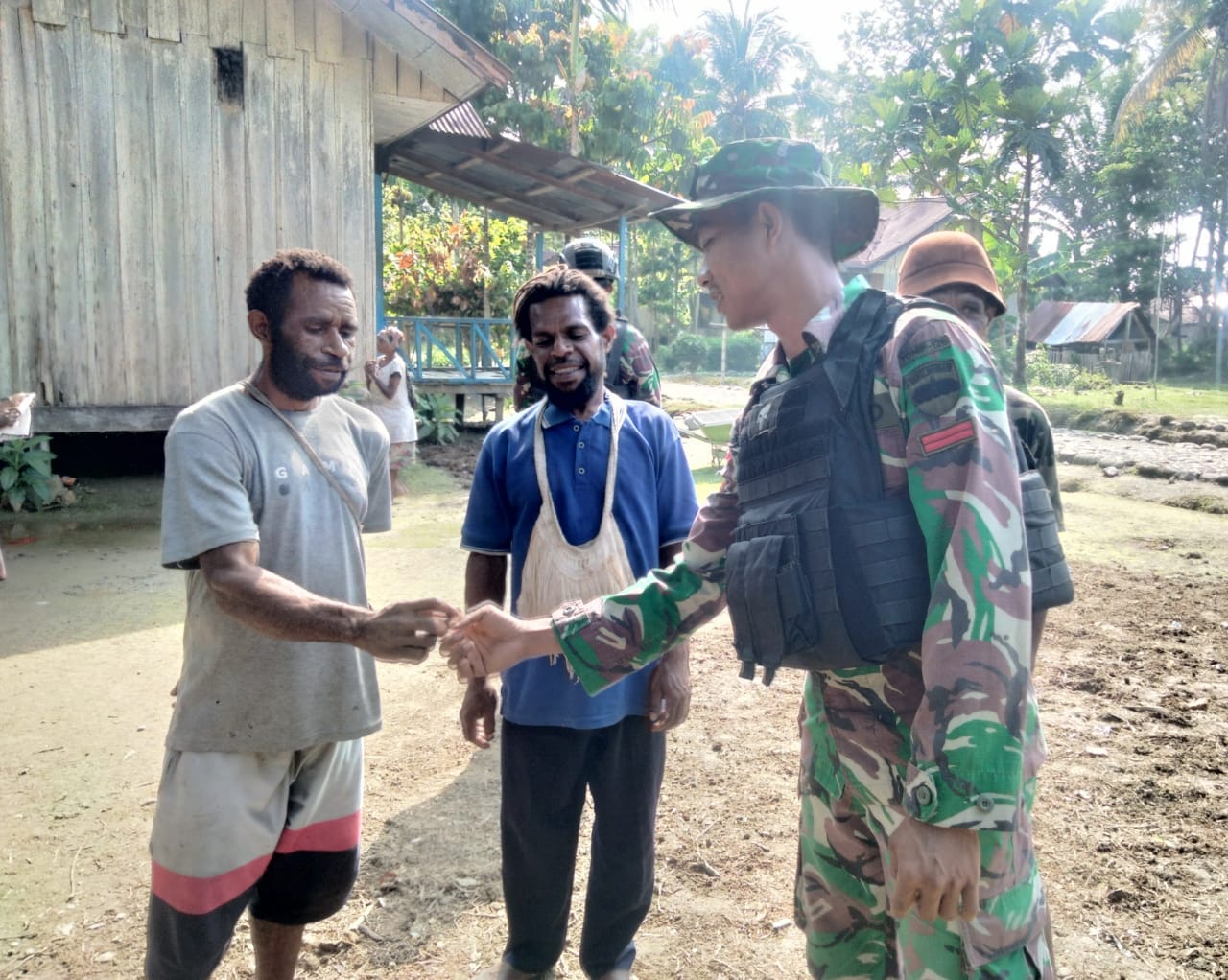 IPNews. Keerom. Memperkuat pembinaan teritorial di wilayah perbatasan Papua, personel Satgas Pamtas RI-PNG Yonif 126/Kala Cakti Pos Batom sapa warga perbatasan di Kampung Batom II, Distrik Batom, Kabupaten Pegunungan Bintang.