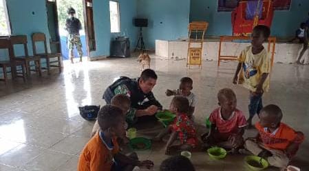 “Satgas Yonif 126/KC Pos Yabanda membagikan 150 Kg beras dan 5 karton meal ready to eat (MRE) atau makanan siap saji jenis Naraga untuk membantu warga dan anak-anak yang sedang mengikuti kegiatan Camping Paskah”, jelas Dansatgas.