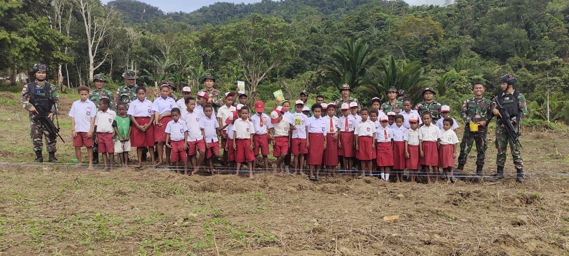 IPNews. Keerom. Personel Satgas Yonif 126/KC mengajak masyarakat di perbatasan Papua untuk memanfaatkan lahan sekaligus memberikan edukasi tentang pertanian kepada murid-murid Sekolah Dasar YPPK Akarinda, Distrik Web, Kabupaten Keroom.