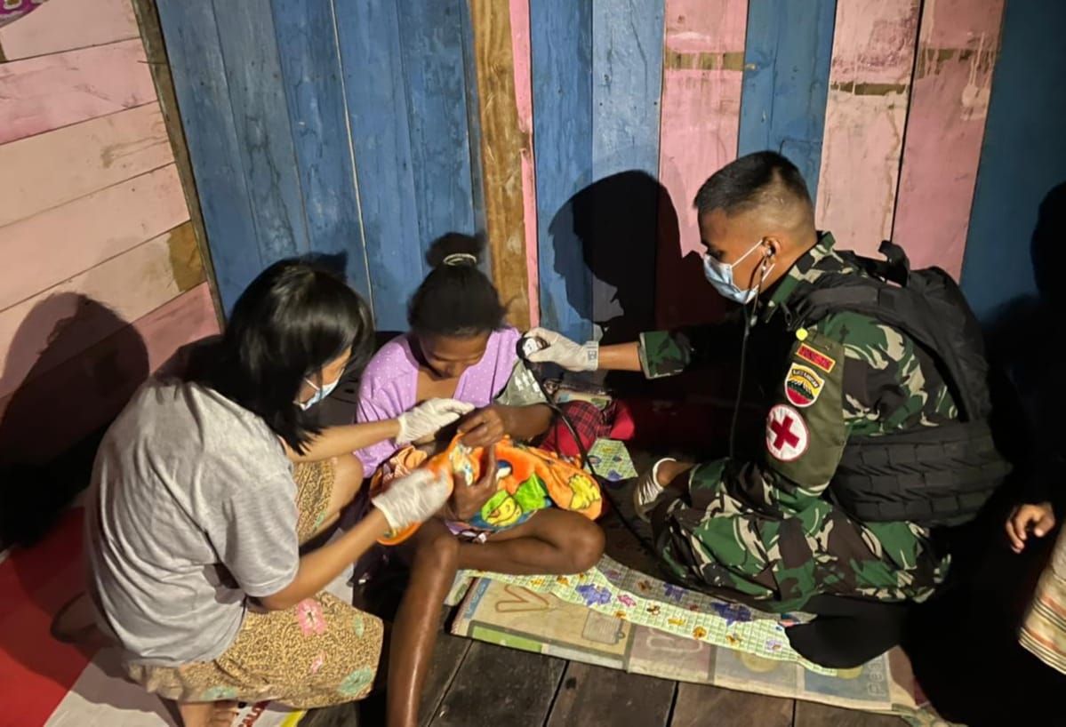IPNews. Keerom. Tugas mulia dilakukan Personel Satgas Pamtas RI-PNG Yonif 126/KC bersama Nakes Puskesmas setempat, dalam membantu proses persalinan anak kedua Ibu Yustina di Kampung Umuaf, Distrik Web, Kabupaten Keerom.