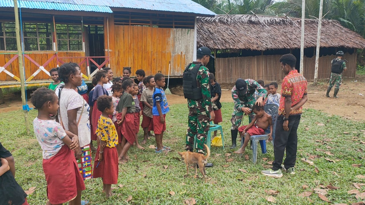 IPNews. Keerom. Sebagai wujud kepedulian kepada anak-anak perbatasan untuk menanamkan kerapian sejak dini kepada anak-anak perbatasan, personel Satgas Pamtas RI-PNG Yonif 126/KC Pos Tatakra menggelar pangkas rambut gratis anak-anak SD Inpres Fafinimbo Kampung Tatakra, Distrik Web, Kabupaten Keerom.