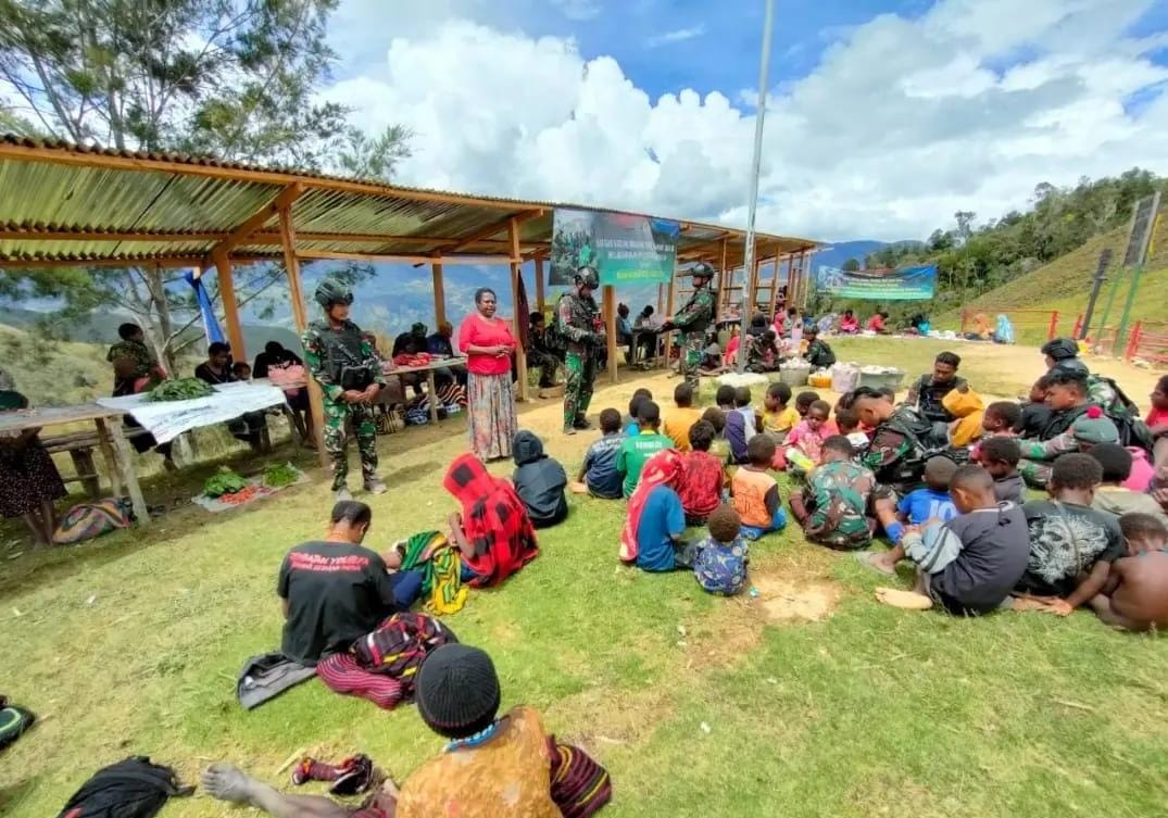 IPNews Lanny Jaya. Satgas Yonif Mekanis 203/AK Pos Popome hadir di tengah-tengah masyarakat untuk mengajak anak-anak Papua di Pegunungan Tengah khususnya Distrik Popome belajar sambil bermain di Distrik Popome, Kabupaten Lanny Jaya, Papua, Kamis (03/11/2022).