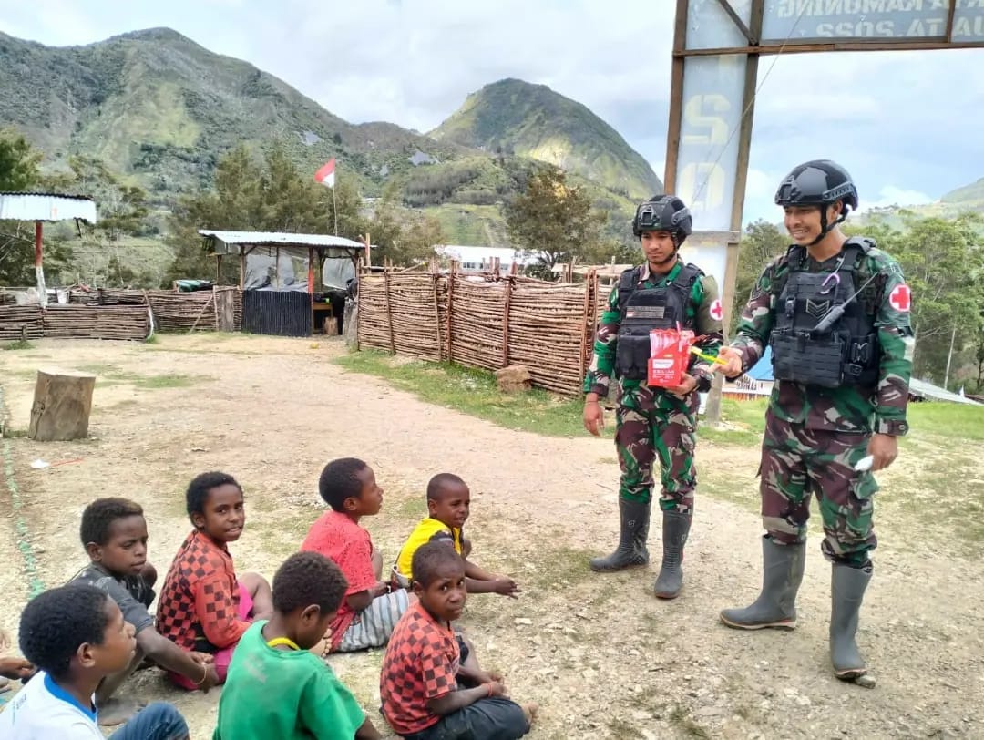 IPNews. Lanny Jaya. Minimnya kepedulian anak-anak Pegunungan Tengah terhadap kesehatan gigi, Satgas Yonif Mekanis 203/AK Pos Pirime memberikan edukasi menjaga kesehatan gigi yang baik dan benar yaitu dengan mengadakan sosialisasi sikat gigi kepada anak-anak di Distrik Pirime, Kabupaten Lanny Jaya, Papua, Kamis (15/12/2022).