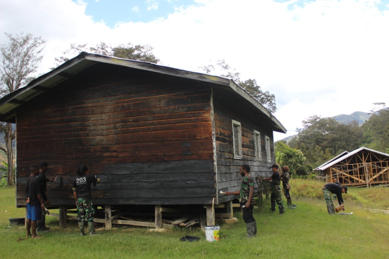 IPNews. Lanny Jaya. Personel Pos Tima Satgas Yonif Mekanis 203/AK bekerja sama dengan Artha Graha melaksanakan karya bhakti bersama dengan para jemaat dan masyarakat Gereja Baptis Manggalome, Desa Tima, Distrik Balingga, Kabupaten Lanny Jaya, Papua, Minggu (02/04/2023).