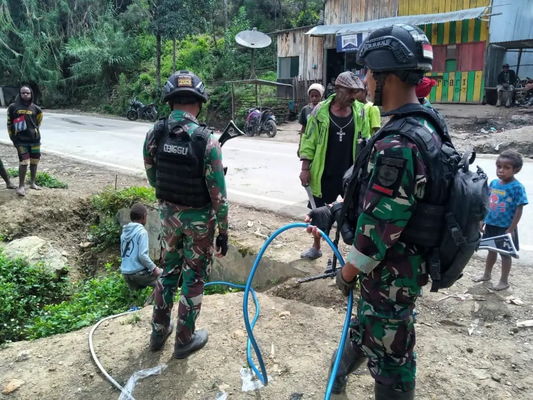IPNews. Lanny Jaya. Kepedulian Pos Pirime Satgas Yonif Mekanis 203/AK terhadap masalah air yang di alami oleh warga di Kampung Wenam, Distrik Pirime, dengan memberikan selang untuk mengaliri air bersih menuju Kampung Wenam, Distrik Pirime, Kabupaten Lanny Jaya, Papua, Sabtu (10/12/2022).