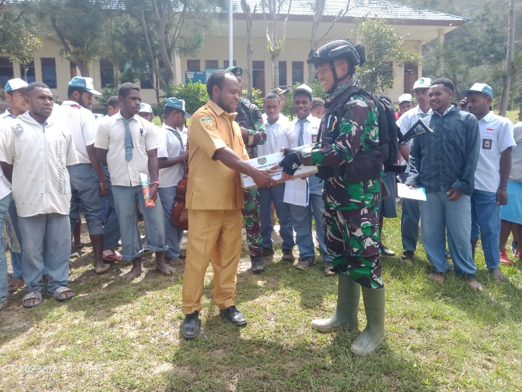 IPNews. Lanny Jaya. Personel Satgas Yonif Mekanis 203/AK Pos Makki hadir di SMAN 2 Makki guna memberikan penyuluhan wawasan kebangsaan dan memberikan semangat maupun motivasi belajar serta memberikan sosialisasi rekrutmen TNI untuk murid-murid SMAN 2 Makki, Distrik Makki, Kabuputen Lanny Jaya, Rabu (8/3/2023).