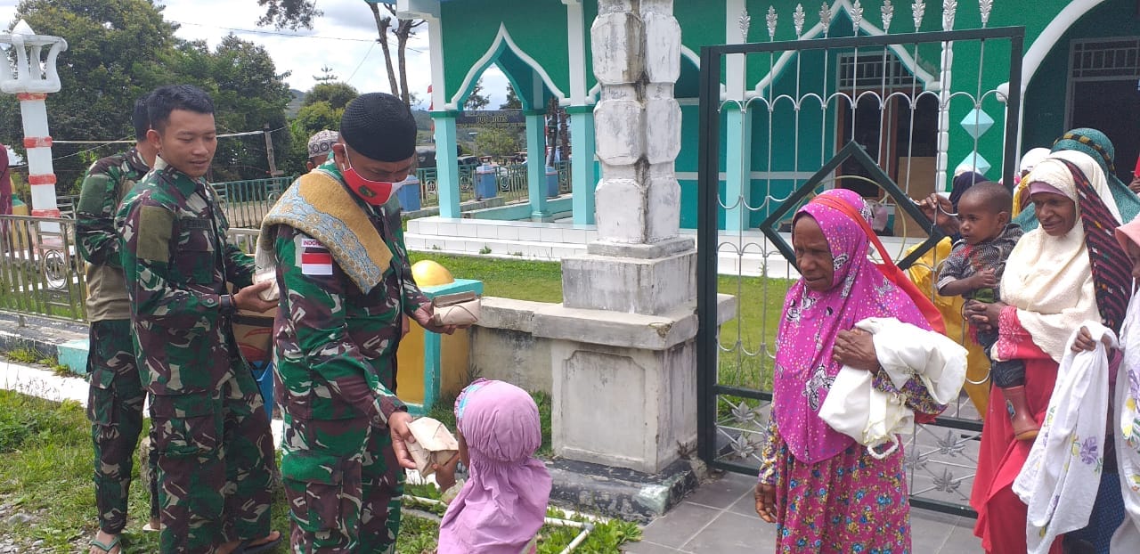 Usai melaksanakan Sholat Jumat, Dansatgas Yonif RK 751/VJS Letkol Inf Dedy Dwi Cahyadi, S.I.P beserta anggota langsung menuju pintu masuk masjid dan membagikan nasi bungkus yang sudah disiapkan kepada seluruh jamaah yang keluar dari masjid.