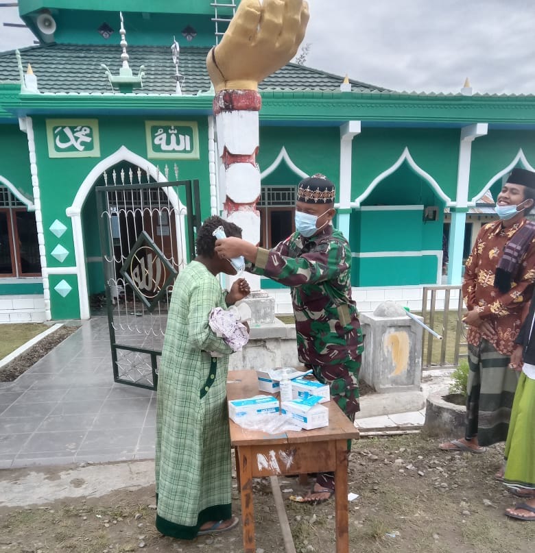 Sebelum peringatan Maulid Nabi Muhammad SAW dimulai, Pasiter Satgas Yonif 751 Letda Inf A. Sirait bersama 3 personel melakukan pengawasan dipintu masuk sekaligus membagikan masker kesehatan dan menyemprotkan hand sanitizer kepada masyarakat yang masuk ke lokasi masjid.