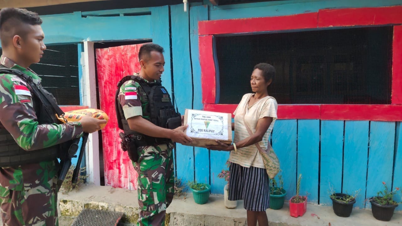 IPNews. Keerom. Bentuk kepedulian kepada masyarakat di wilayah binaannya. Personel Pos Kout Satgas Yonif 126/KC yang di pimpin Wadan Satgas Mayor Inf Wahidin Sobar, Sos. memberikan bantuan sembako kepada masyarakat binaan di Kampung Kalilapar 1 Distrik Waris, Kabupaten Keerom.