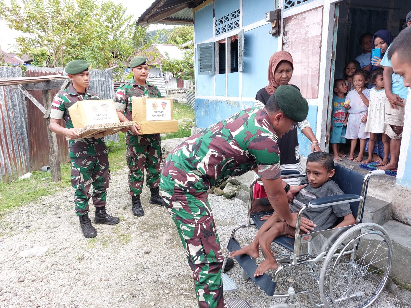 Dikatakan Dansatgas kursi roda tersebut diberikan kepada Fadli Cahaya Bakay (13) anak yatim piatu yang memiliki keterbelakangan fisik yaitu kedua kakinya tidak dapat digunakan layaknya anak-anak pada umumnya. “Kursi roda ini kita berikan kepada Fadli untuk membantunya dalam berkatifitas sehari-hari,” ujarnya.