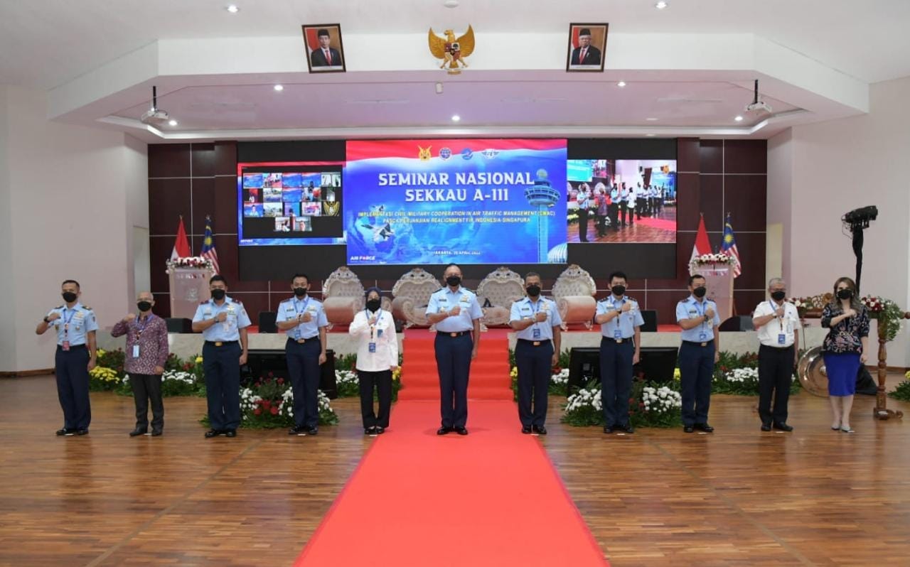 IPNews. Jakarta. Kepala Staf Angkatan Udara  (Kasau) Marsekal TNI Fadjar Prasetyo, SE. MPP. CSFA. membuka Seminar Nasional Perwira Siswa Sekkau Angkatan ke-111 dengan tema “Implementasi Civil-Military Cooperation in Air Traffic Management (CMAC) Pasca Perjanjian Realignment Flight Information Region (FIR) Indonesia-Singapura” di Gedung Pramanasala, Sekkau, Jakarta, Senin (25/4/2022).
