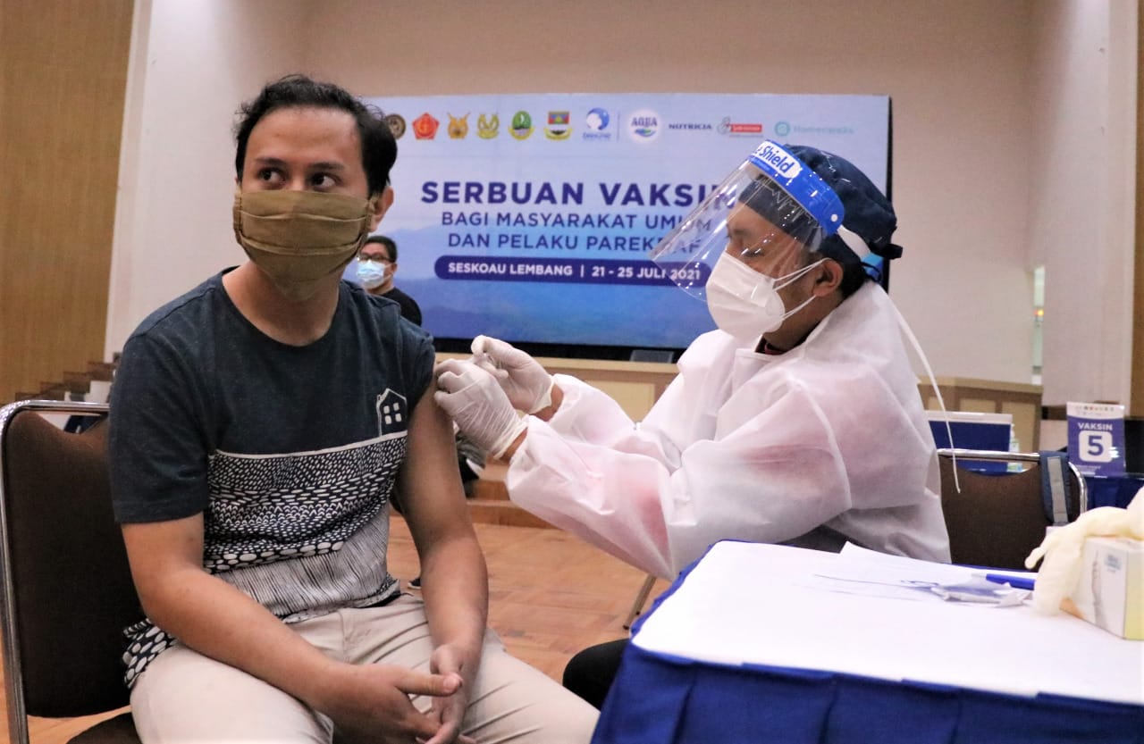 Kemenkes RI, Kemenparekraf RI, Seskoau, Pemprov Jawa Barat, Pemkab Bandung Barat, Danone, dan Homecare24 bekerja sama menyelenggarakan Serbuan Vaksinasi