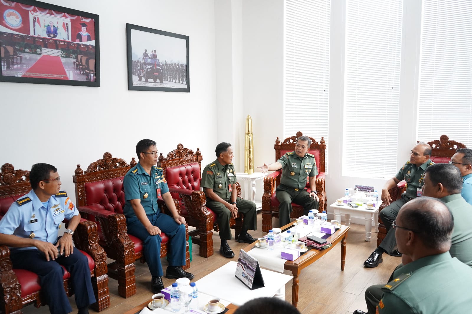 IPNews. Jakarta. Kapuspen TNI Mayjen TNI Dr. Nugraha Gumilar, M.Sc., didampingi Kolonel Inf I Ketut Murda (Kabidum), Kolonel Sus Aidil (Kabid MC), Kolonel Laut (P) Agung Saptoadi (Kabidpenum), dan Letkol Cba Tedi Rudianto (Kabidinternasional) bersilaturahmi dengan Rektor Universitas Pertahanan (Unhan) Letjen TNI Jonni Mahroza, bertempat di Kampus Unhan, Salemba, Jakarta Pusat, Selasa (13/2/2024).