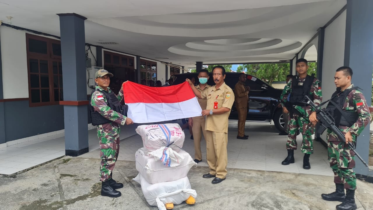 IPNews. Keerom. Menyambut HUT RI Ke-77 tahun 2022, Pemda Kabupaten Keerom mendukung 3.000 Bendera Merah Putih kepada Satgas Pamtas RI-PNG Yonif 126/KC untuk dibagikan kepada masyarakat di perbatasan.