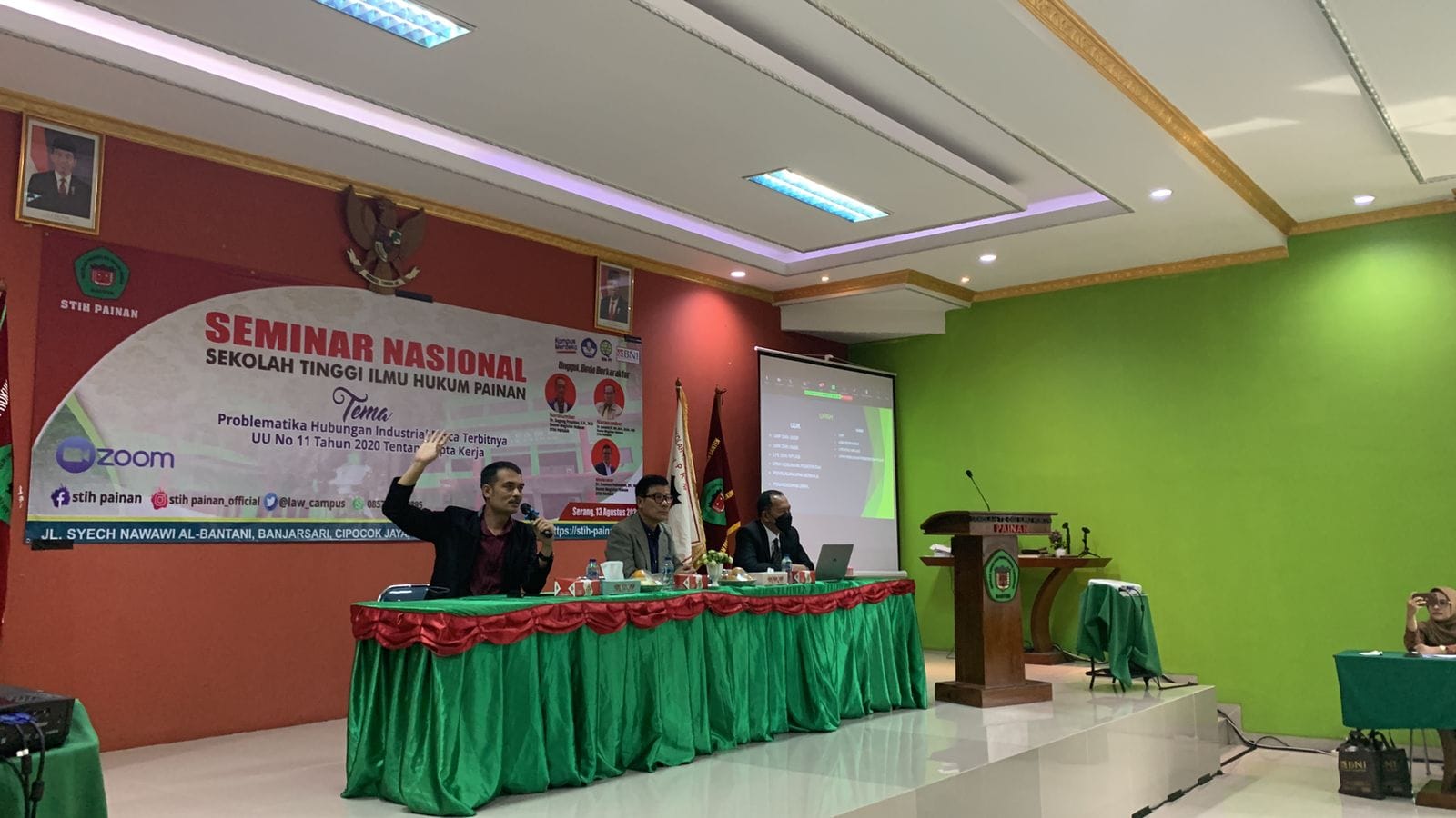 IPNews. Jakarta. Sekolah Tinggi Ilmu Hukum (STIH) Painan mengadakan kegiatan webinar nasional dengan tema : “Problematika Hubungan Industrial Pasca Terbitnya UU NO 11 Tahun 2020 Tentang Cipta Kerja”. Hadir dalam kesempatan tersebut seluruh unsur pimpinan STIH Painan serta diikuti lapisan masyarakat mulai akademisi, mahasiswa, organisasi ketenagakerjaan.