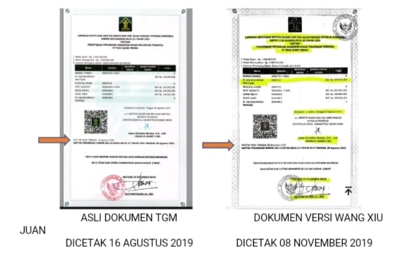 Onggo juga menyampaikan ke awak media bahwa bukti yang dimunculkan oleh kuasa hukum Wang Xiu Juan di media elektronik justru patut diduga tidak valid karena jika diperhatikan bukti asli yang dimiliki PT. TGM adalah hasil cetak yang dilakukan notaris pada tanggal 16 Agustus 2019, sedangkan bukti yang dipublikasikan oleh Richard William dicetak tanggal 08 November 2019, dengan demikian maka siapa yang “bermain” dan siapa yang punya kepentingan atas perubahan data tersebut ? Dari hasil perbandingan SK Menkumham, ternyata SK yang dipublikasikan oleh kuasa hukum tidak dapat di scan barcodenya.
