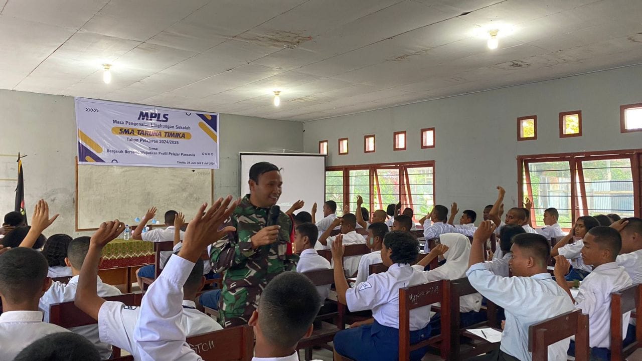 IPNews. Timika. Babinsa Koramil 1710-02/Timika, Sertu Tumpak Marpaung memberikan materi tentang PBB dan Kepemimpinan kepada siswa siswi baru SMA Taruna, Sabtu (29/06/2024). Kegiatan tersebut dilaksanakan di SMA Taruna, Kel. Kamoro Jaya, Distrik Mimika Baru, Kabupaten Mimika yang diikuti oleh sekitar 50 orang siswa siswi baru.