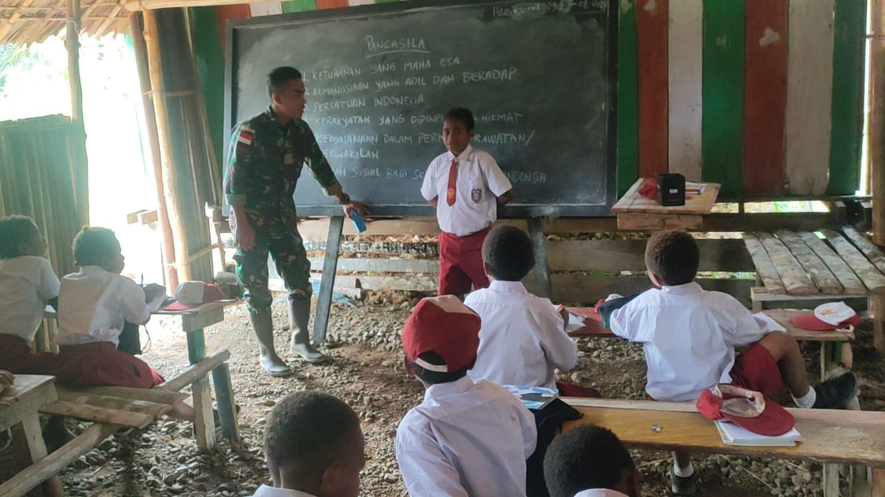 IPNews. Keerom. Tanamkan nilai-nilai Pancasila kepada anak-anak perbatasan, Satgas Pamtas Yonif 126/KC Pos Tatakra memberikan wawasan kebangsaan kepada siswa-siswi SD Inpres Fanilbo Kampung Tatakra, Distrik Web, Kabupaten Keerom.
