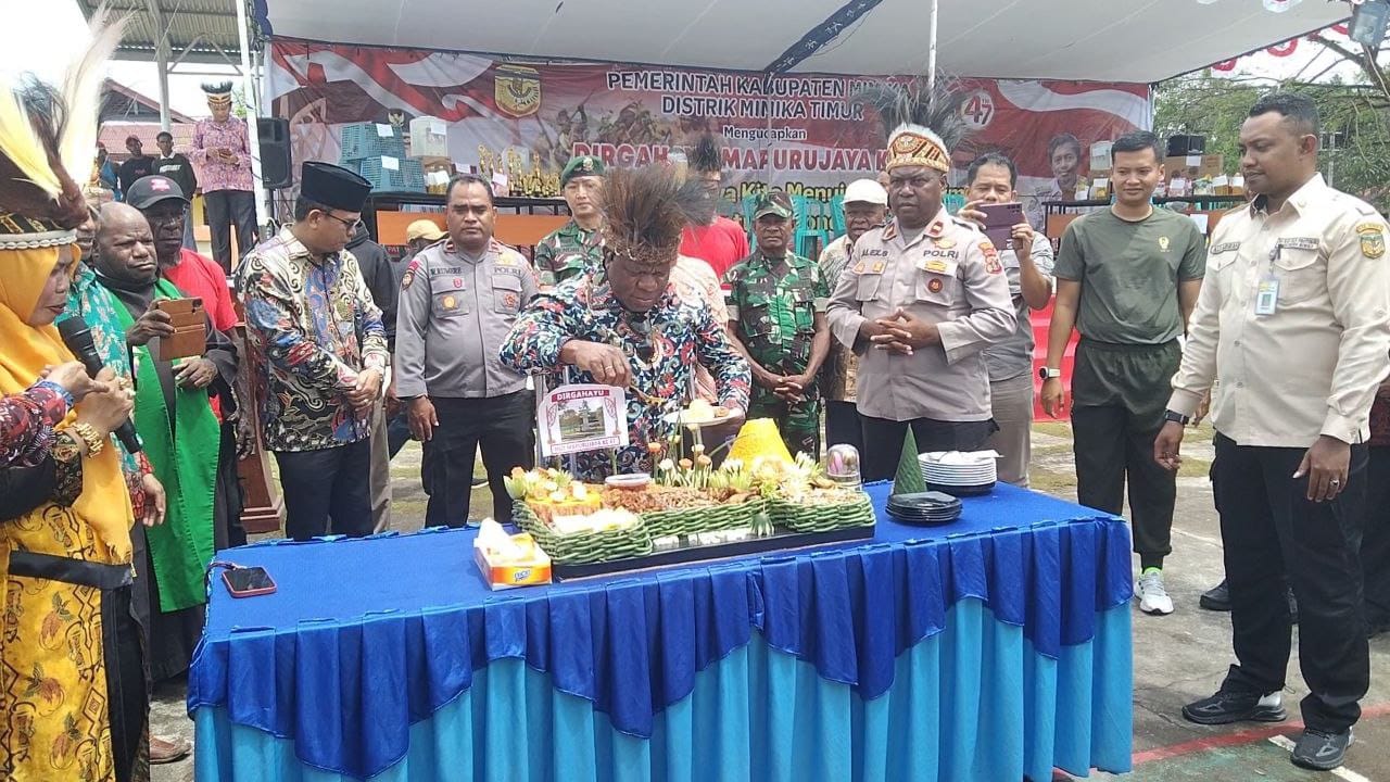 IPNews. Timika. Danramil 1710-07/ Mapurujaya Lettu Inf Yakonias Maniagasi bersama dengan sejumlah anggota Koramil turut menghadiri peringatan Hari Ulang Tahun (HUT) Distrik Mimika Timur yang ke-47 tahun 2023, bertempat di Kantor Distrik Mimika Timur, Kabupaten Mimika, Sabtu (19/08/2023).