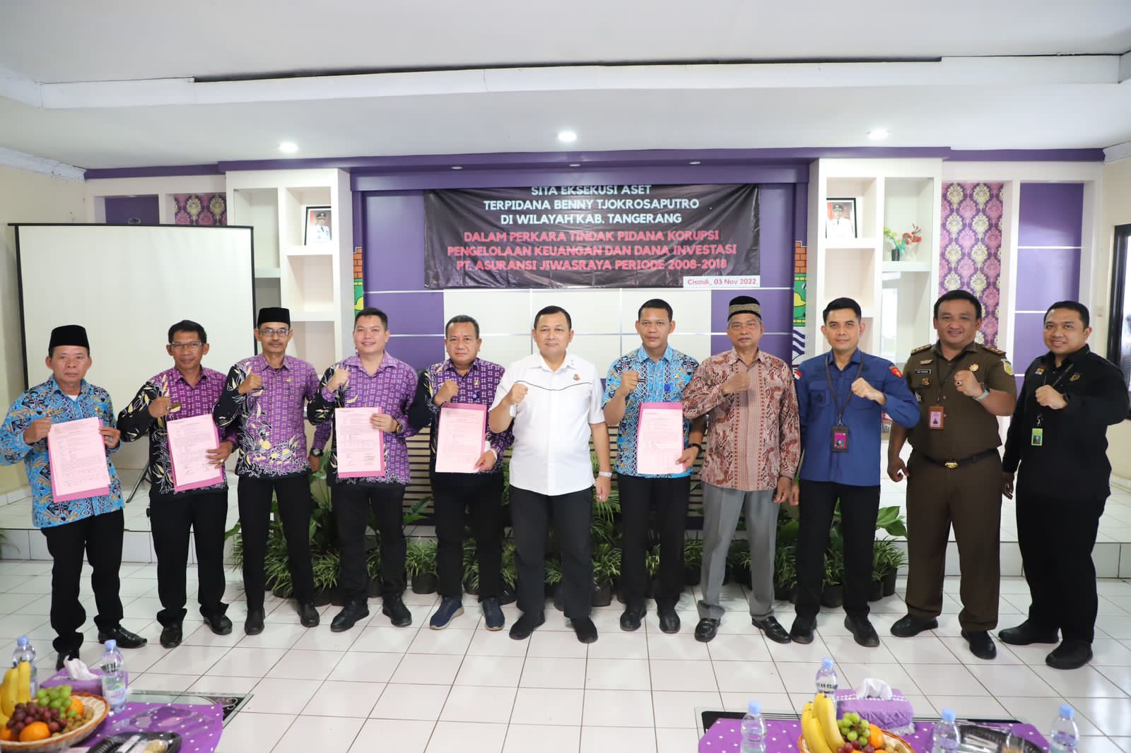 Selanjutnya, sebagai penerimanya yaitu Camat Cisauk Yusuf Fachroji dan Camat Pagedangan Zainuddin. “Adapun acara penempatan perimaan benda sitaan hari ini disaksikan Direktur Upaya Hukum Luar Biasa, Eksekusi dan Eksaminasi (Uheksi) Undang Mugopal, perwakilan Pusat Pemulihan Aset (PPA) Erik Ludfiansyah dan tokoh masyarakat Arjani,” ucapnya.