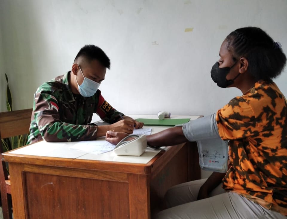 IPnews. Keerom. Vaksinator Covid-19 di Perbatasan beraksi. Hal itu sebagai bentuk dukungan terhadap pemerintah di bidang kesehatan dalam rangka menghentikan penyebaran Covid-19 di perbatasan Papua, Tim Kesehatan Satgas Pamtas Yonif 126/KC Pos Senggi menggandeng Puskesmas Distrik Senggi, menggelar serbuan vaksinasi di Kampung Senggi, Distrik Senggi, Kabupaten Keerom, Papua.
