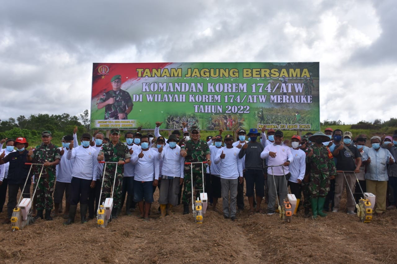IPNews. Merauke. Membantu program pemerintah dalam meningkatkan ketahanan pangan, Brigjen TNI E. Reza Pahlevi, SE. selaku Komandan Korem 174/ATW melakukan penanaman jagung bersama Gapoktan (Gabungan Kelompok Tani) binaan Korem 174/Anim Ti Waninggap, di Kampung Ngutibob (Sarmayam 2) Distrik Tanah Miring, Kabupaten. Merauke, Papua, Sabtu (23/04/22).