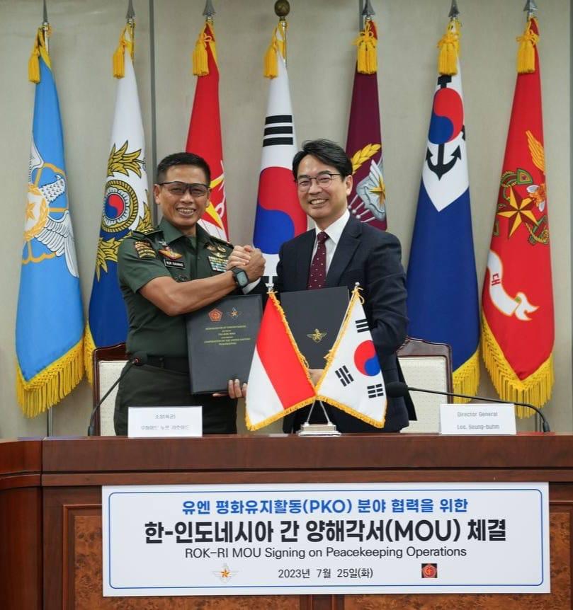 IPNews. Jakarta. Asisten Operasi (Asops) Panglima TNI, Mayor Jenderal TNI Muhammad Nur Rahmad bersama Director General, International Policy Bureau, MND ROK, Mr. LEE, Seung-Buhm melaksanakan penandatanganan Memorandum of Understanding United Nations Peacekeeping Operations (MOU UN PKO) antara TNI dan ROKAF bertempat di Kementerian Pertahanan Republik Korea, baru-baru ini.