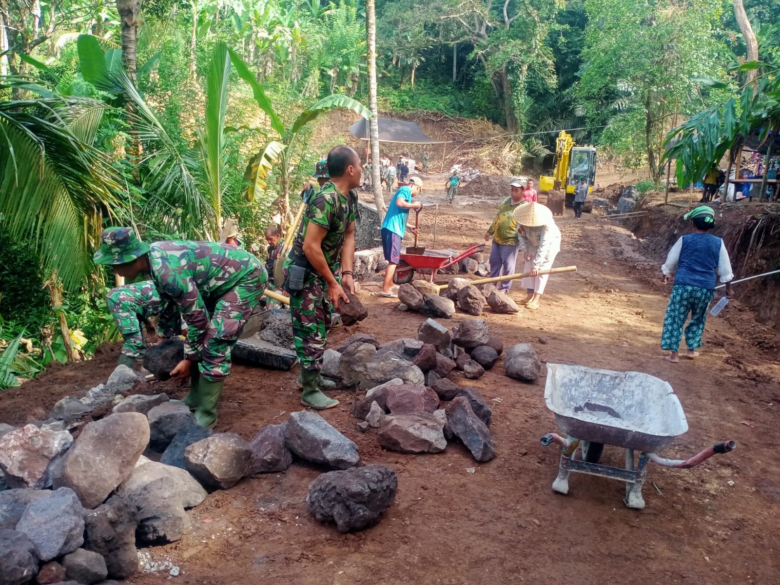 Terlihat warga tak mau kalah cepat dengan para prajurit Kodim 1623/ Karangasem yang tergabung dalam Satgas TMMD ke-119 di Dusun Bukit Catu, Desa Selumbung, Kecamatan Manggis, Kabupaten Karangasem, Jumat (23/2/2024).