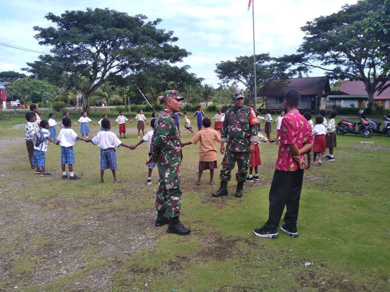 IPNews. Timika. Kebersamaan antara TNI dan rakyat harus terus dibangun sejak dini demi menumbuhkan rasa persatuan dan kemanunggalan. Mempedomani hal tersebut, Babinsa Koramil 1710-07/Mapurujaya dipimpin Serma Puryanto melaksanakan kegiatan Binwanwil di SD YPPK, Kp. Muare, Distrik Mimika Timur, Kabupaten Mimika, Rabu (31/05/2023).
