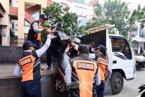 Langsung bertindak tak menunggu lama, jajaran Sudin Perhubungan dan Satpol PP bersama dengan unsur Polisi dan TNI, setelah apel langsung menyasar ke sejumlah lokasi. Di Pasar Baru dan Mangga Dua petugas berhasil mengamankan 25 kendaraan roda dua yang parkir tidak pada tempatnya.