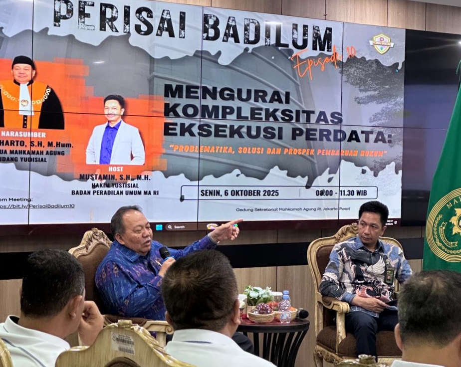 Demikian disampaikan Wakil Ketua Mahkamah Agung (MA) Bidang Yudisial, Suharto, dalam kegiatan PERISAI Episode 10 bertema “Mengurai Kompleksitas Eksekusi Perdata: Problematika, Solusi, dan Proses Pembaharuan Hukum” yang digelar pada Senin (6/10/2025).